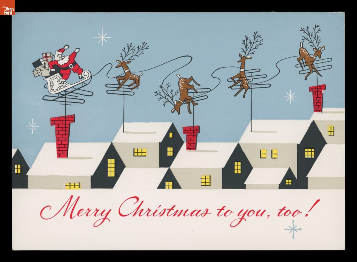 Since the late 1800s, sending Christmas cards to family, friends, and neighbors has become a holiday tradition for those who celebrate. Many cards feature traditional holiday images (Santa, trees, candles, etc.). Some even depict the new technologies that affect Americans' lives. This humorous card from the 1950s shows Santa and his reindeer entangled in television antennas sprouting on rooftops at that time.
