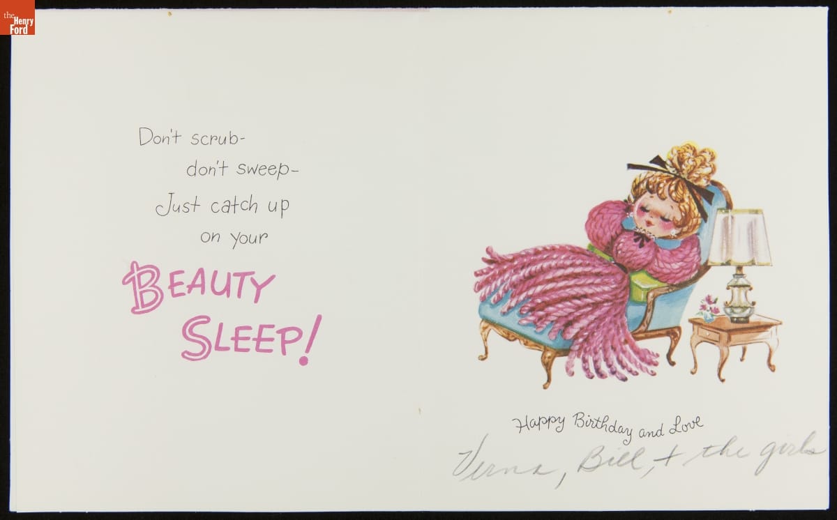 Colorful, commercially designed greeting cards were popular in early 20th-century America--especially on birthdays and holidays. The image and message on this card reflect traditional gender roles, in which the mother did the cooking and housecleaning for her family. Only on her birthday, the card suggests, was she allowed to take a break.