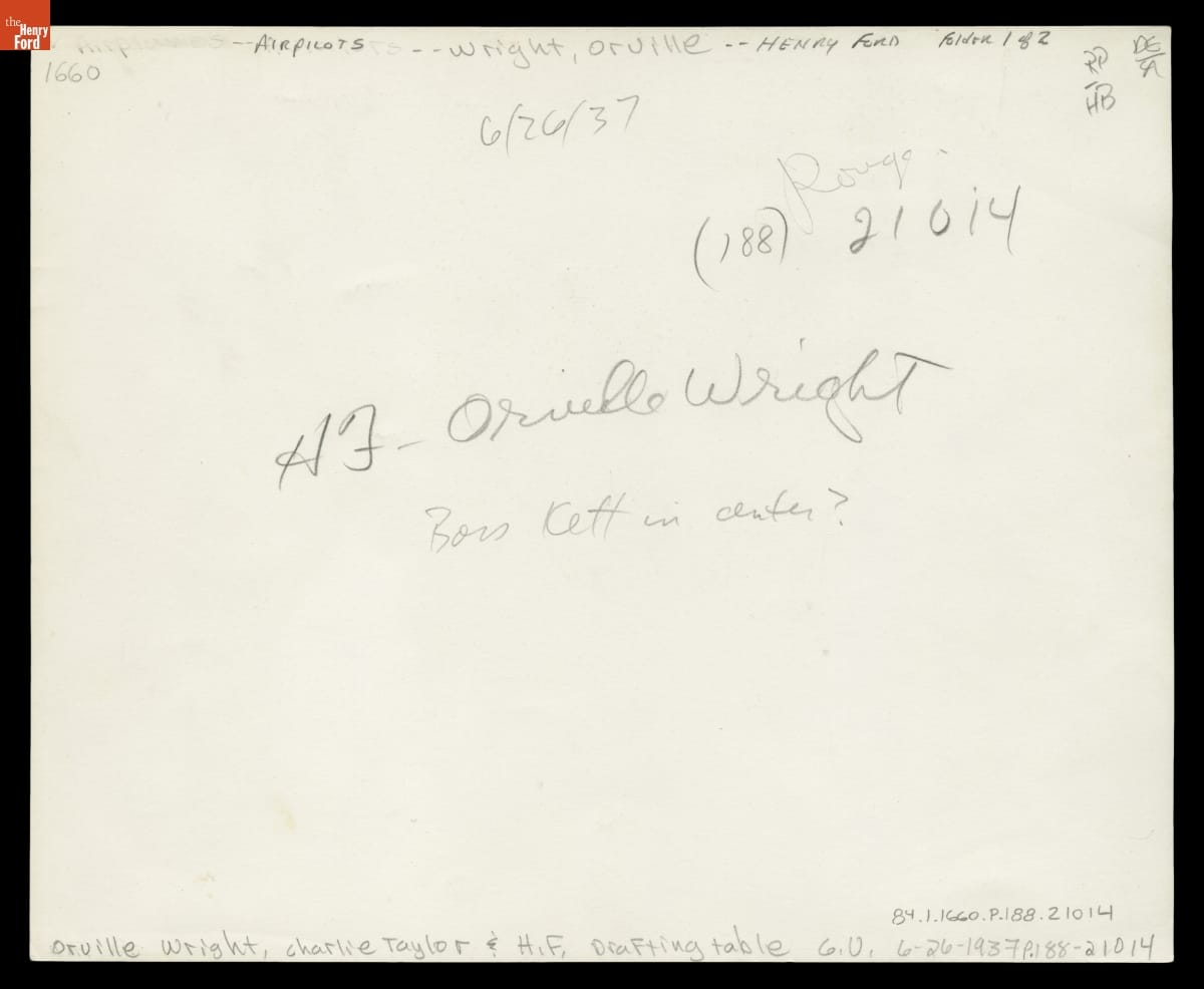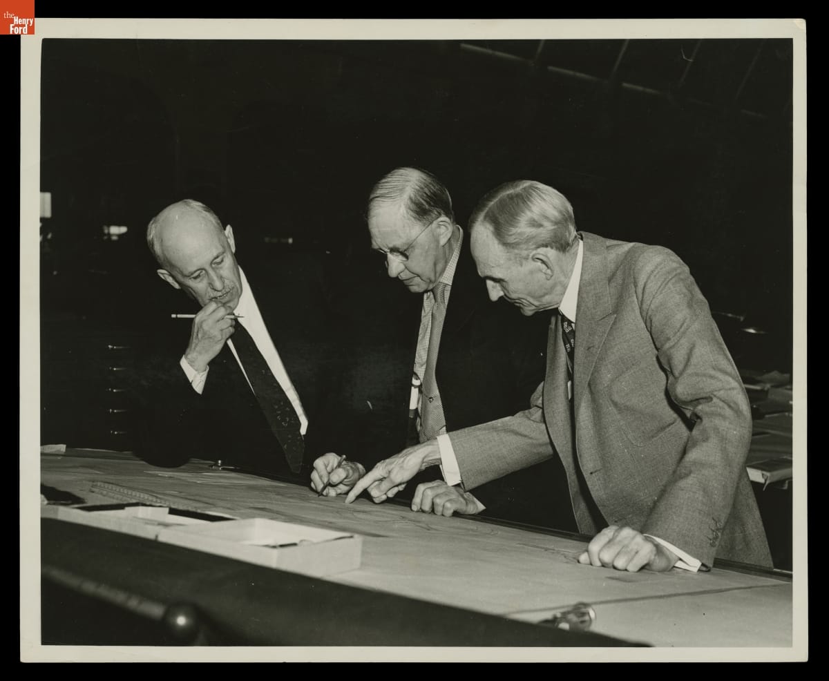 Orville Wright, Charles Taylor, and Henry Ford at Drafting Table, June 1937
