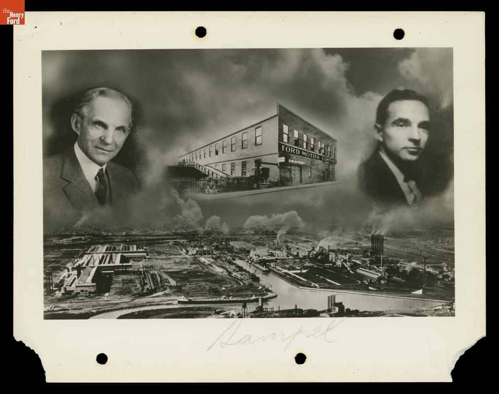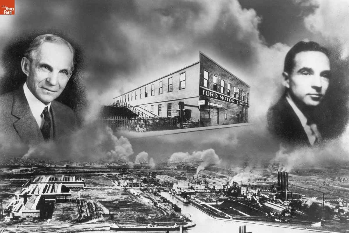 This 1934 composite photo brought together portraits of Henry Ford and Edsel Ford, along with images of two of Ford Motor Company's factories. The Mack Avenue plant was the company's first home, from April 1903 to late 1904. The Rouge factory's first facilities opened in 1917. By 1934 the Rouge was among the largest industrial complexes in the world.