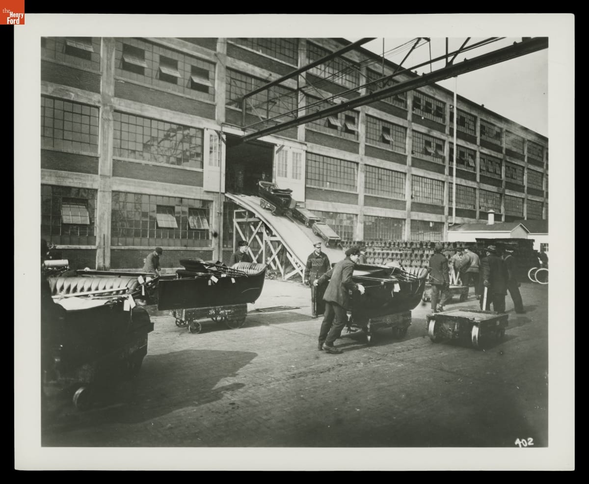 Workers Moving Automobile Bodies at Ford Motor Company Highland Park Plant, 1914