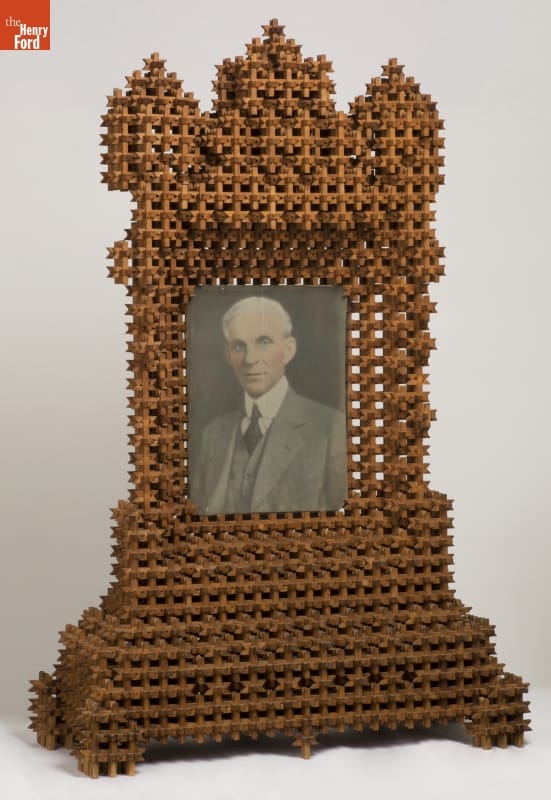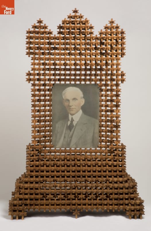 Acknowledging Henry Ford's innovative spirit, individuals employing their own original and imaginative efforts bestowed hundreds of handmade gifts upon him. The effect of this magnificent frame may actually surpass the image of the individual it was meant to honor. Composed of intricately interlocking wooden pieces, the frame stands over four feet tall!