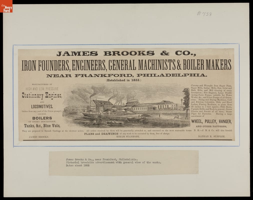 This circa 1855 broadside advertised James Brooks & Co., located in the Frankford area of Philadelphia, Pennsylvania. James Brooks & Co. was in the business of manufacturing stationary steam engines, as well as locomotives and boilers. The broadside includes a pictorial rendering of the factory along the river.