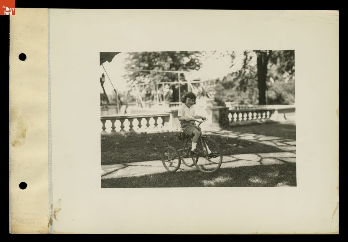 William Clay Ford (1925-2014) was Henry Ford's grandson and the youngest of Edsel and Eleanor Clay Ford's four children. He is shown here at age four, riding a tricycle on the grounds of Fair Lane, the Dearborn estate of his grandfather Henry and grandmother Clara Ford.
