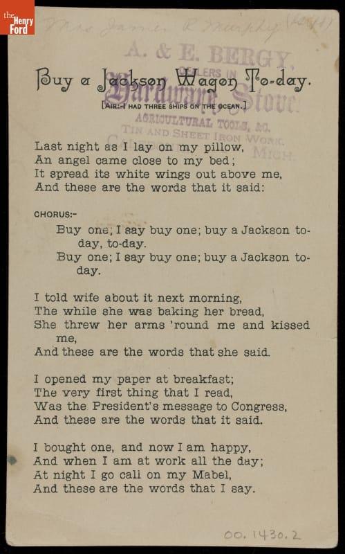 Trade Card for Jackson Wagons, Austin, Tomlinson & Webster Mfg. Co., 1880-1890
