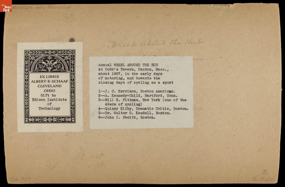 Annual WHEEL AROUND THE HUB / at Cobb's€™s Tavern, Canton, Mass., / about 1907, in the early days / of motoring, and towards the / closing days of cycling as a sport / 1--J.C. Kerrison, Boston American / 2--A. Kennedy-Child, Hartford, Conn. / 3--Will R. Pittman, New York (one of the / 49ers of cycling) / 4--Quincy Kilby, Dramatic Critic, Boston. / 5-- Dr. Walter G. Kendall / 6--John J. Fecitt, Boston