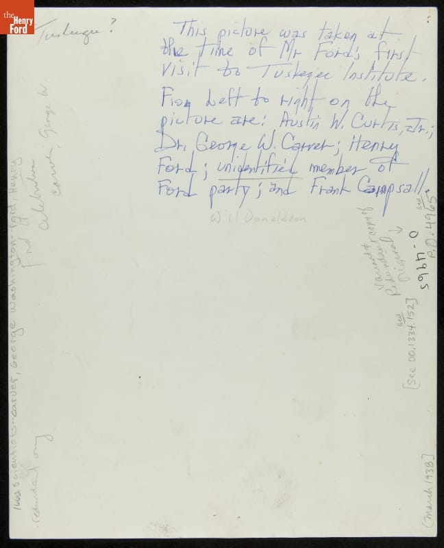 Handwritten in ink on back of image: This picture was taken at / the time of Mr. Ford's first / visit to Tuskegee Institute. / From Left to right on the / picture are: Austin W. Curtis, Jr; / Dr. George W. Carver; Henry / Ford; unidentified member of / Ford party; and Frank Campsall / Will (Wilbur) Donaldson