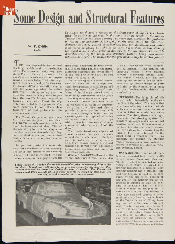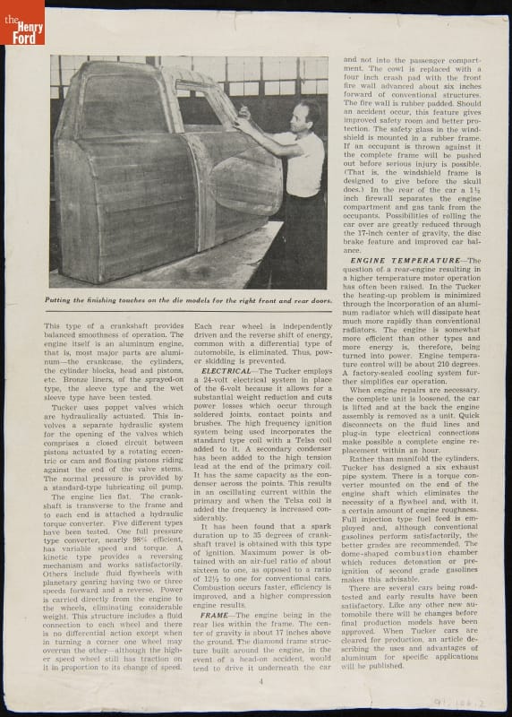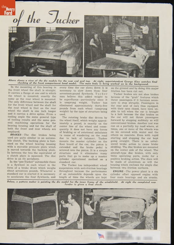 Preston Tucker previewed his all-new Tucker 48 sedan with a massive marketing campaign. Articles and advertisements heralded the car's many features said to improve performance, safety, and economy. Some of these claims were premature. The hydraulic torque-converter transmission and disc brakes described in this article, for example, never actually made it into Tucker's production cars.