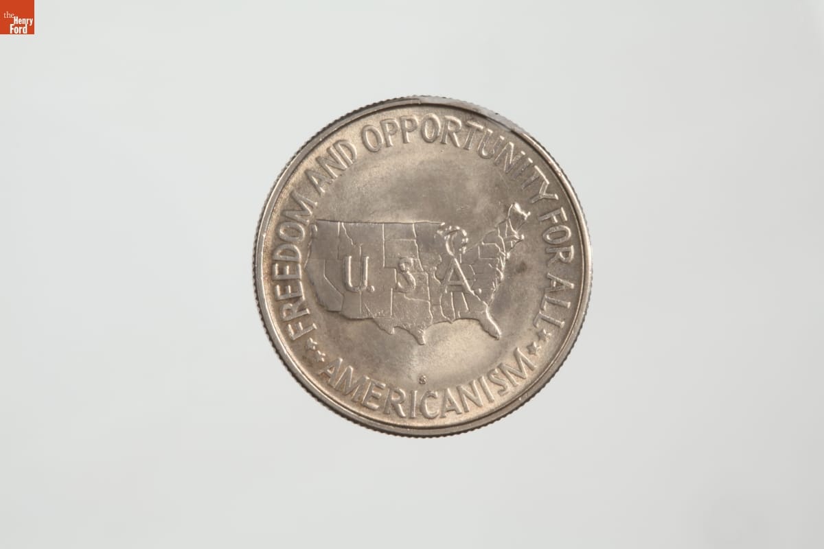 The second U.S. coin commemorating African Americans featured two Tuskegee Institute educators, president Booker T. Washington (1856-1915), and agricultural scientist, George W. Carver (early 1860s-1943). The U.S. Mint commissioned African-American sculptor and artist Isaac Scott Hathaway to design the coin. Issued from 1951 to 1954, the inscription on the back emphasized patriotism and individual liberty amid growing Cold War tensions.