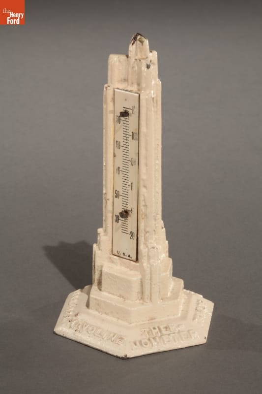 Chicago's 1933-34 Century of Progress Exposition used the theme of progress to buoy national optimism during the darkest years of the Great Depression. Many fairgoers returned home with mementos, such as this souvenir model of Havoline Motor Oil's fair building -- a twenty-one-story working thermometer.
