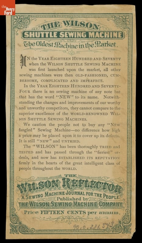 Product manufactured by Wilson Sewing Machine Company, Chicago, Illinois. Card printed by Clay, Cosack & Company, Buffalo, New York.