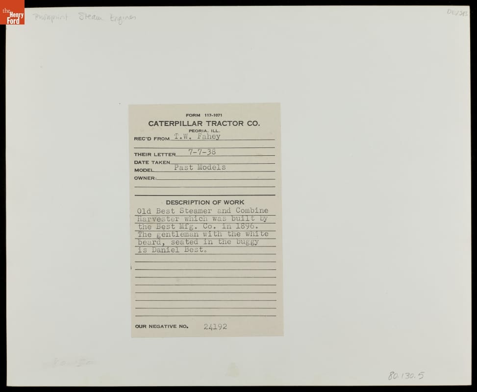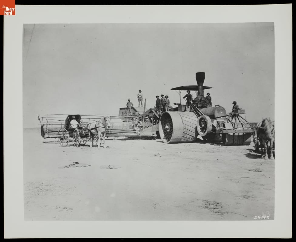 Workers with Best Manufacturing Company Steam Tractor and Combine Harvester, circa 1896