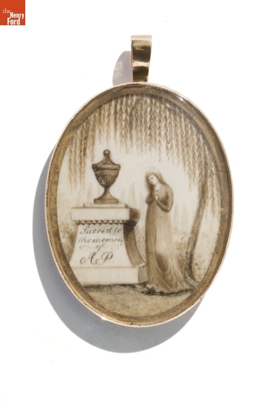 Before the 20th century, death came early and often. One way people coped was to wear jewelry as memorials to their loved ones. Over the centuries, mourning jewelry followed the prevailing fashions. Shortly after independence, Americans favored illuminated, miniature brooches and pendants painted on ivory. These featured shapes derived from classical design, symbols such as urns and weeping women dressed as ancient Romans.