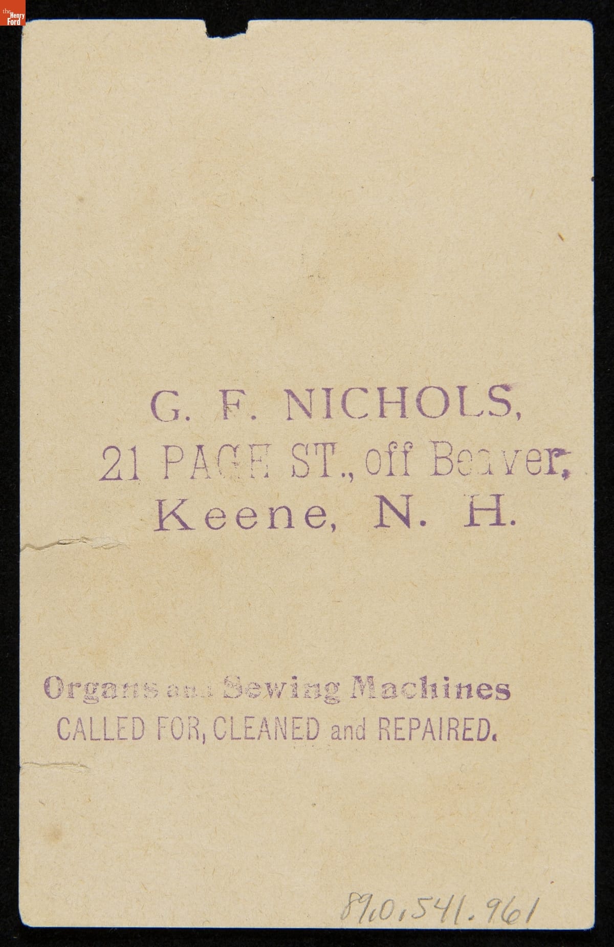 Product by Household Sewing Machine Company, sold by G.F. Nichols. Card by Knapp Company Lithography.
