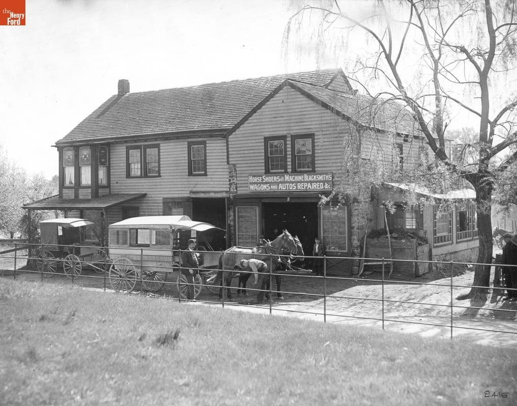 Building with Sign "Horse Shoers and Machine Blacksmiths, Wagons and Autos Repaired," circa 1900
