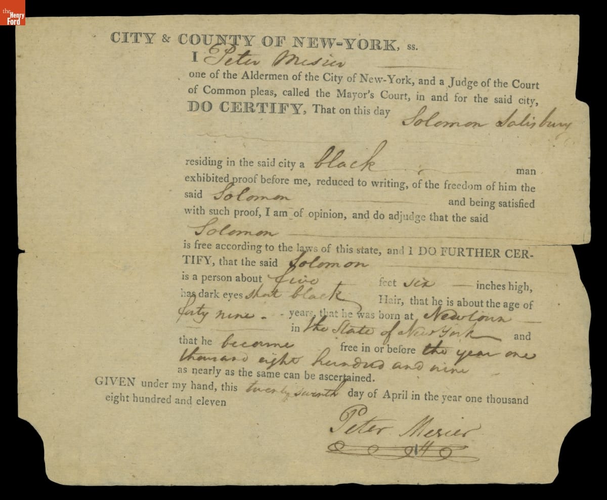 Certificate Verifying Solomon Salisbury's Status as a Free Man, April 27, 1811