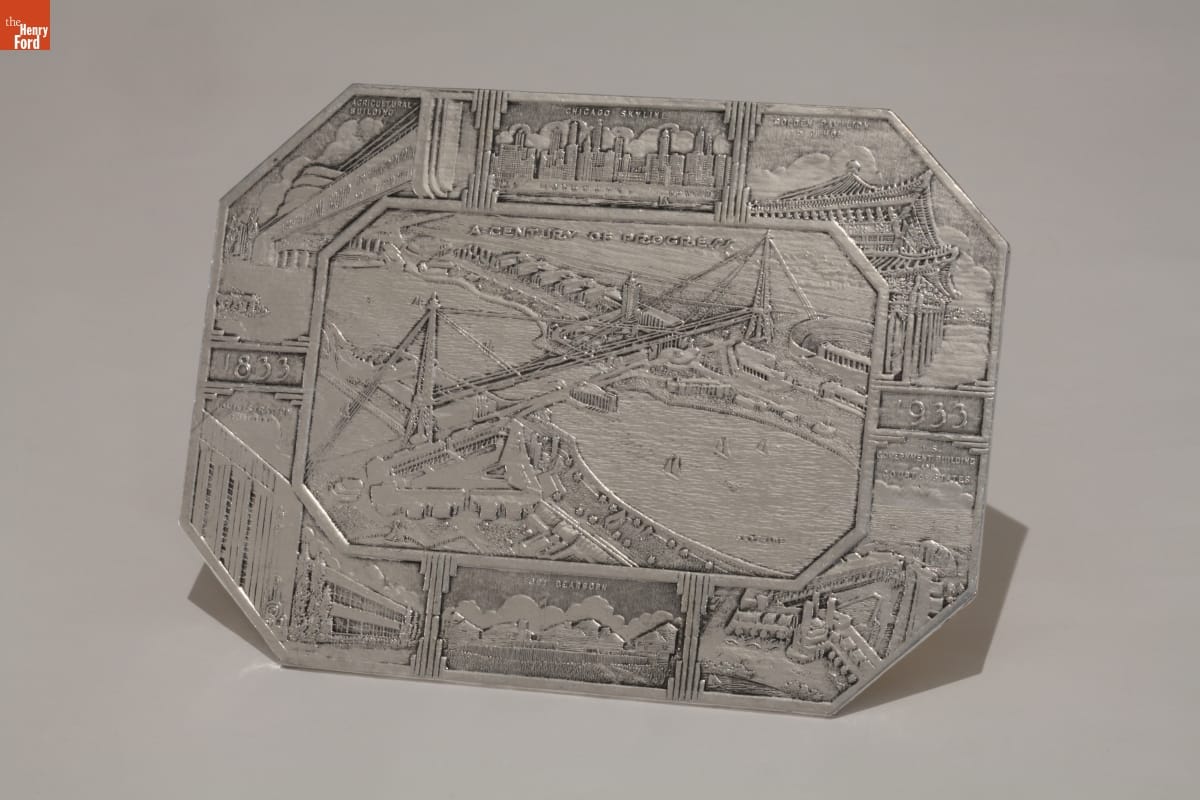 Chicago's 1933-34 Century of Progress Exposition used the theme of progress to buoy national optimism during the darkest years of the Great Depression. Many fairgoers returned home with mementos, such as this coaster depicting landmarks from the exposition.