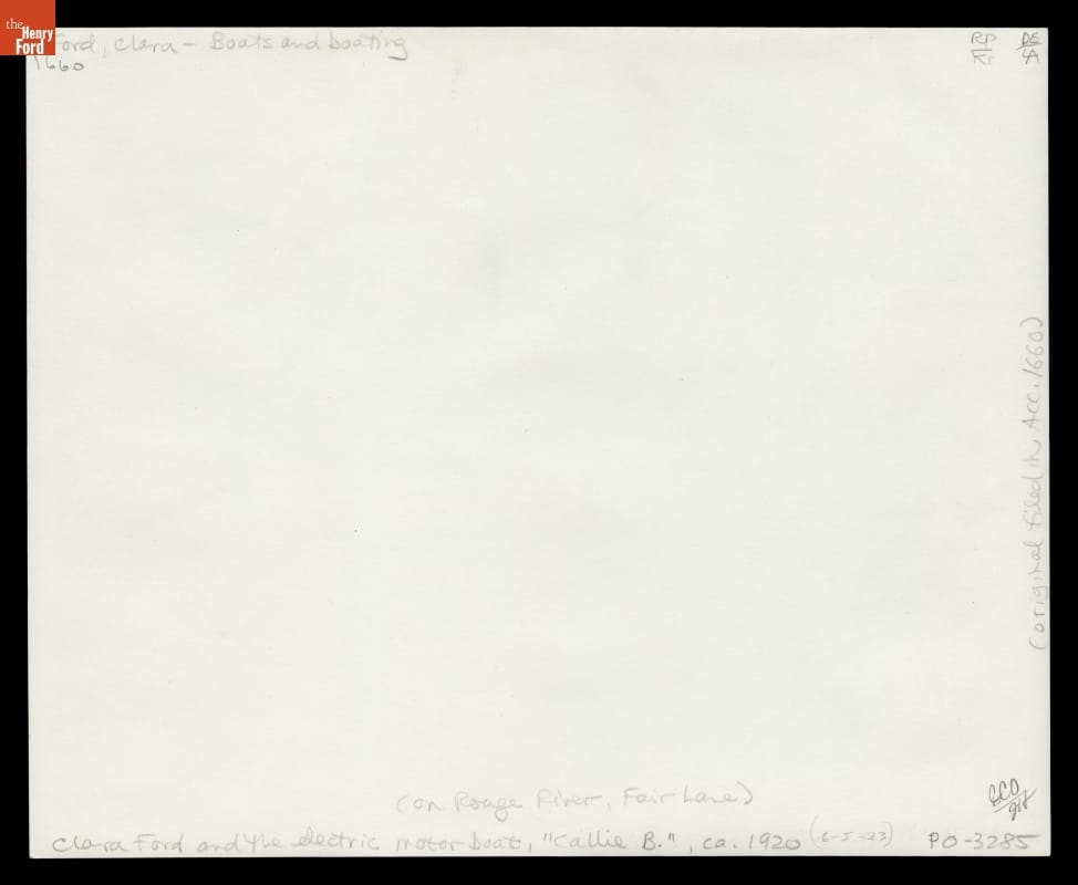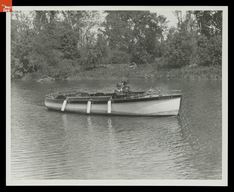 Clara Ford pilots her electric boat, Callie B., on the Rouge River in Dearborn, Michigan. Callie was the affectionate nickname given by Henry Ford to his wife. Mrs. Ford kept her mahogany boat in an underground boathouse next to the couple's residence at Fair Lane Estate.