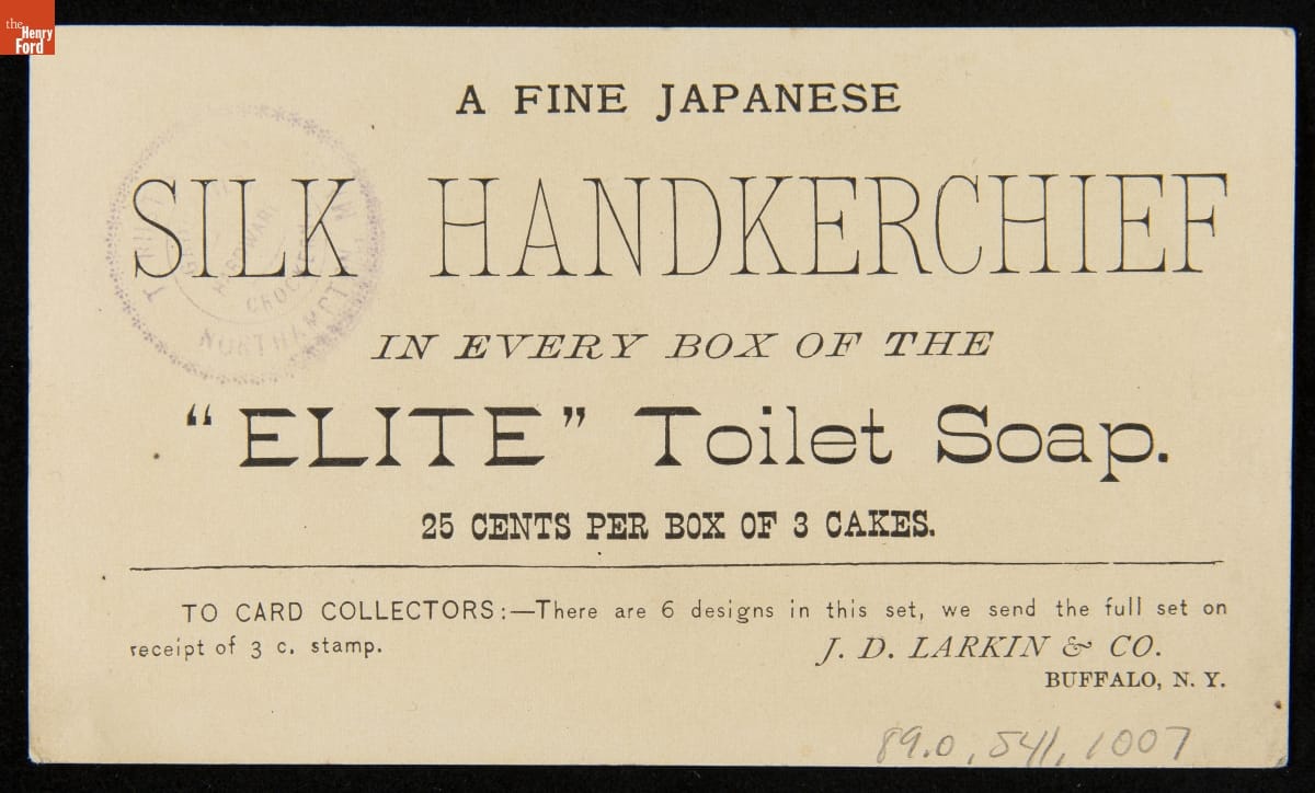 As color printing gained momentum in the late 19th century, advertisers bombarded potential customers with trade cards. Americans enjoyed and often saved the little advertisements found in product packages or distributed by local merchants. J.D. Larkin & Co.'s trade cards were known for promoting premium gifts with the purchase of a product. This card offers a silk handkerchief with the purchase of "Elite" toilet soap.