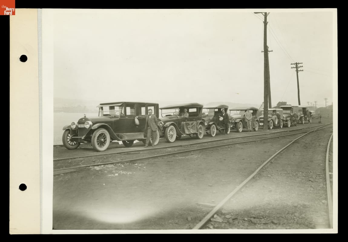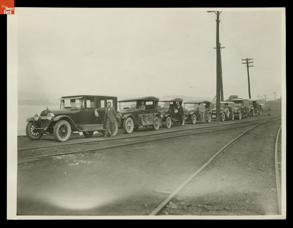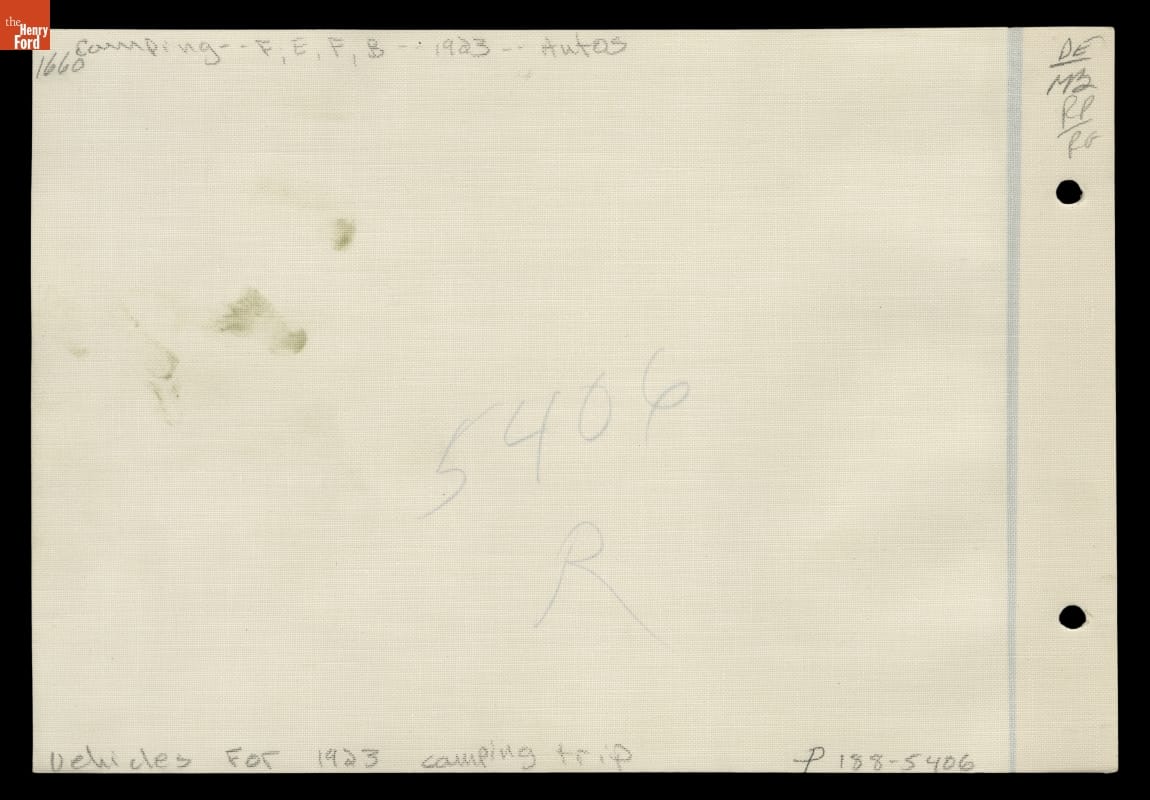 Between 1916 and 1924, Henry Ford, Thomas Edison, Harvey Firestone and John Burroughs embarked on a series of camping trips. They called themselves the Vagabonds, but they camped in style. Numerous support staff set up and took down camp, cooked, took photographs, and maintained the cars and equipment trucks. This photograph shows the Vagabonds' automotive camping caravan in 1923.