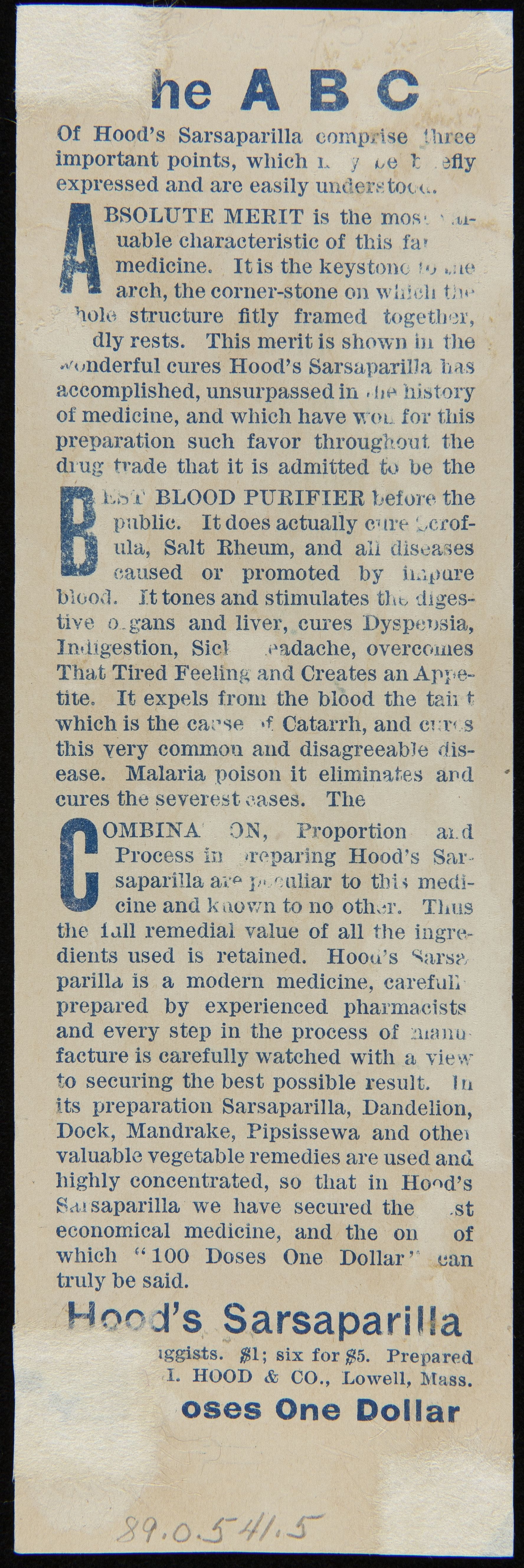 In the late 19th century, trade cards were a major means for advertising goods and services. Patent medicine producer, C.I. Hood & Co., had its own advertising department, creating cookbooks, calendars, and, most abundantly, trade cards. Hood's Sarsaparilla became the company's most popular product and trade cards, like this one, promoted its medicinal qualities as a blood purifier.