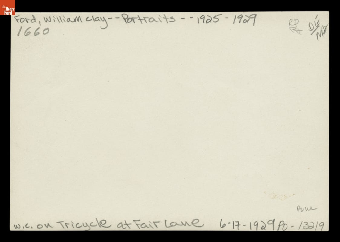 William Clay Ford (1925-2014) was Henry Ford's grandson and the youngest of Edsel and Eleanor Clay Ford's four children. He is shown here at age four, riding a tricycle on the grounds of Fair Lane, the Dearborn estate of his grandfather Henry and grandmother Clara Ford.