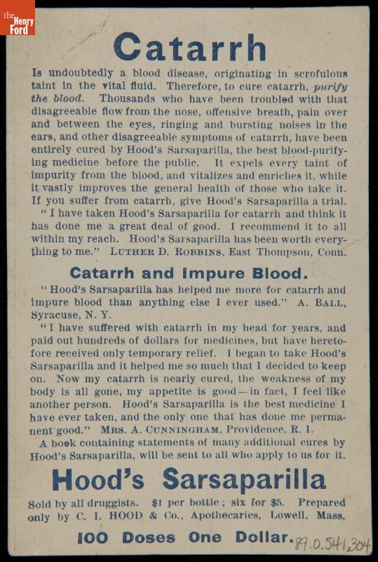 In the late 19th century, trade cards were a major means for advertising goods and services. Patent medicine producer, C.I. Hood & Co., had its own advertising department, creating cookbooks, calendars, and, most abundantly, trade cards. Hood's Sarsaparilla became the company's most popular product and trade cards, like this one, promoted its medicinal qualities as a blood purifier.
