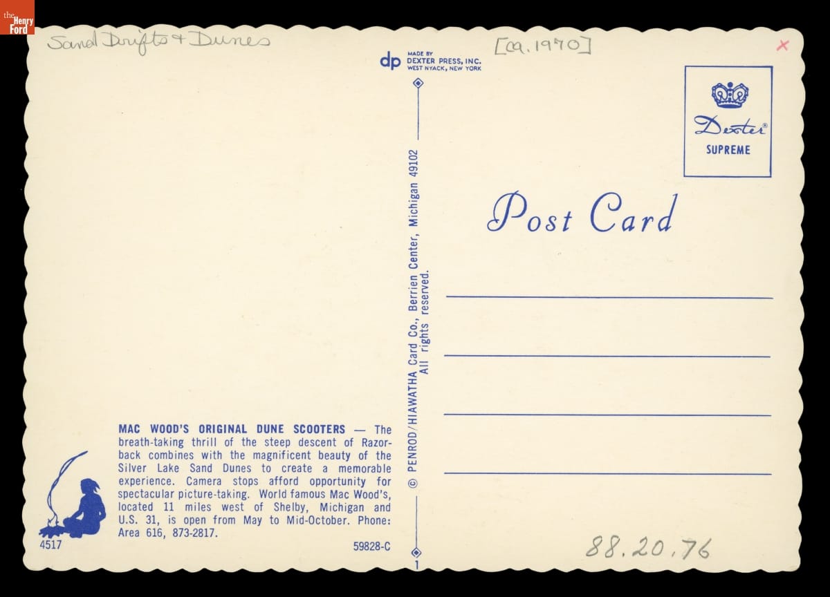 Michigan's Silver Lake Sand Dunes, located between Muskegon and Ludington, are part of a series of dunes along Lake Michigan's eastern shore. They were formed by wind blowing over sand left by glaciers some 10,000 years ago. Visitors to Silver Lake Sand Dunes could ride in specially modified vehicles with wide tires suited to the sandy terrain.