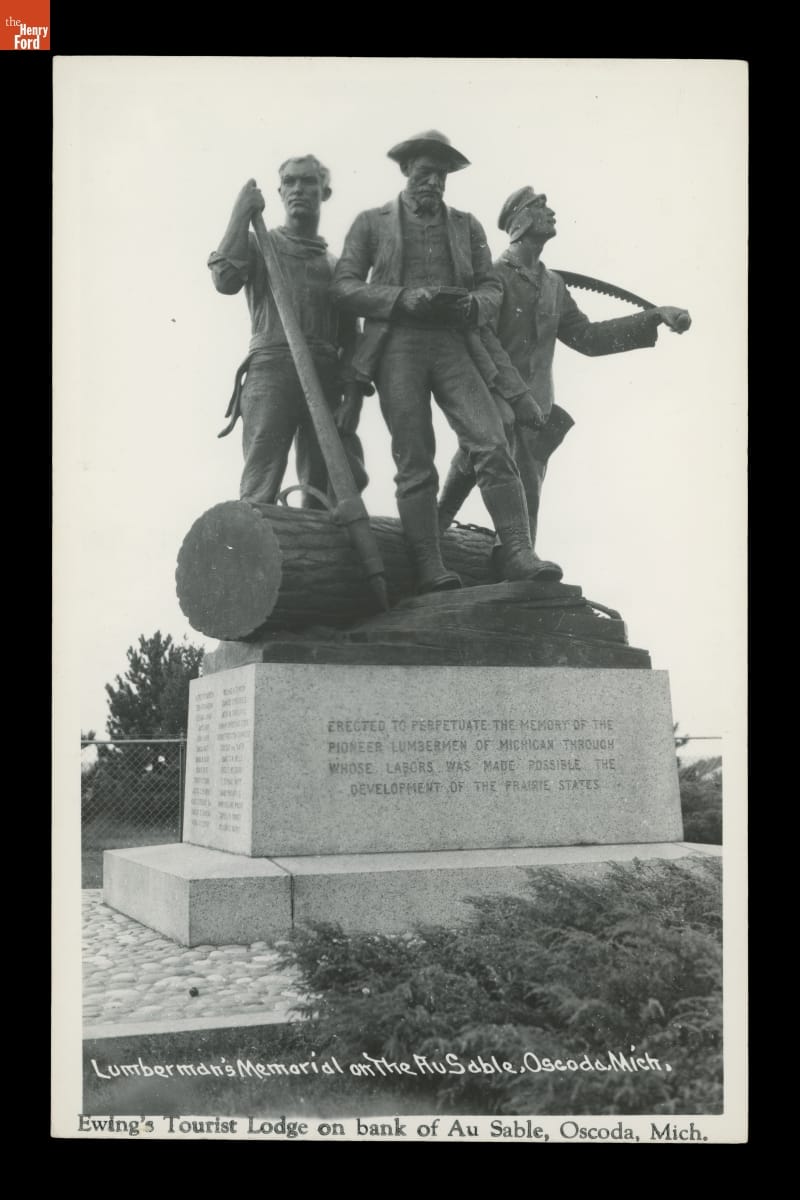 The lumber industry in northern Michigan boomed in the late 19th and early 20th centuries. This postcard depicts the 14-foot monument erected in 1932 near Oscoda, Michigan, dedicated to the area's lumbering history. The monument includes a timber cruiser who surveyed the forest, a sawyer who harvested the trees, and a river rat who guided the valuable logs downriver to the sawmill.