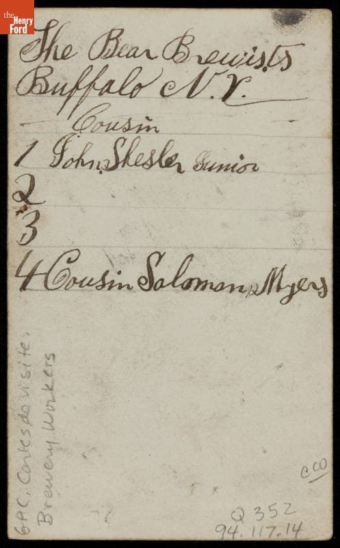 The Bear (sic) Brewists / Buffalo N.Y. / Cousin / 1 John Shelser Junior / 2 / 3 / 4 Cousin Solomon Myers