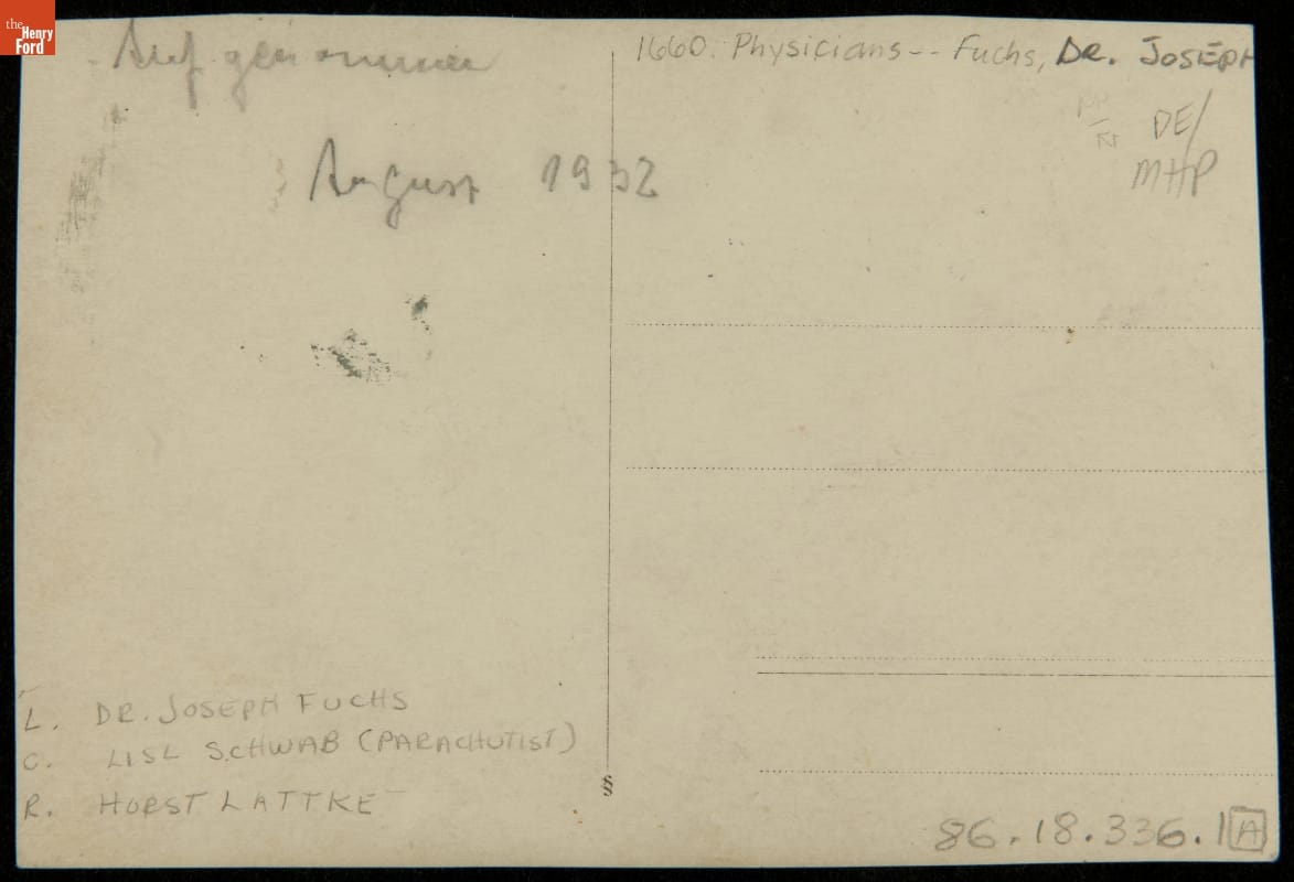 Joseph Fuchs (left) and his friend Horst Lattke posed for a photo with pilot and parachutist Lisl Schwab in 1932. Dr. Fuchs was the original owner of the 1931 Bugatti Royale now in The Henry Ford's collection. He emigrated from Germany to the United States in 1937.