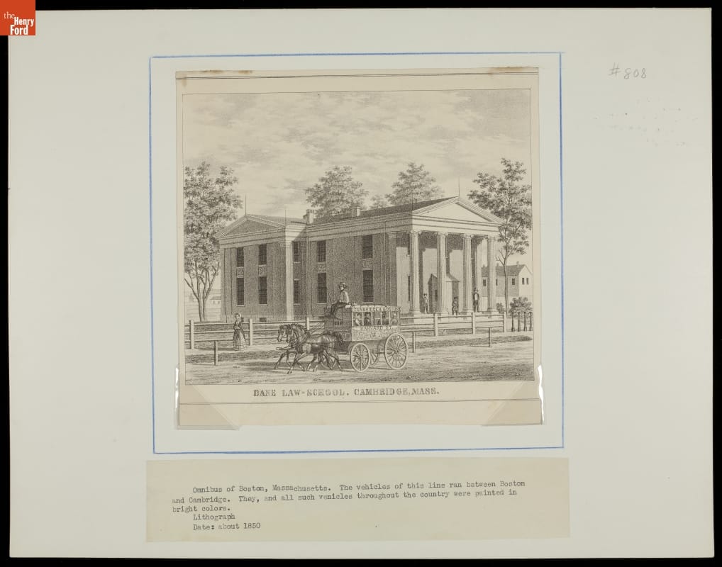 Description beneath: Omnibus of Boston, Massachusetts. The vehicles of this line ran between Boston/ and Cambridge. They, and all such vehicles through out the country were painted in bright colors./ Lithograph./ Date: about 1850.