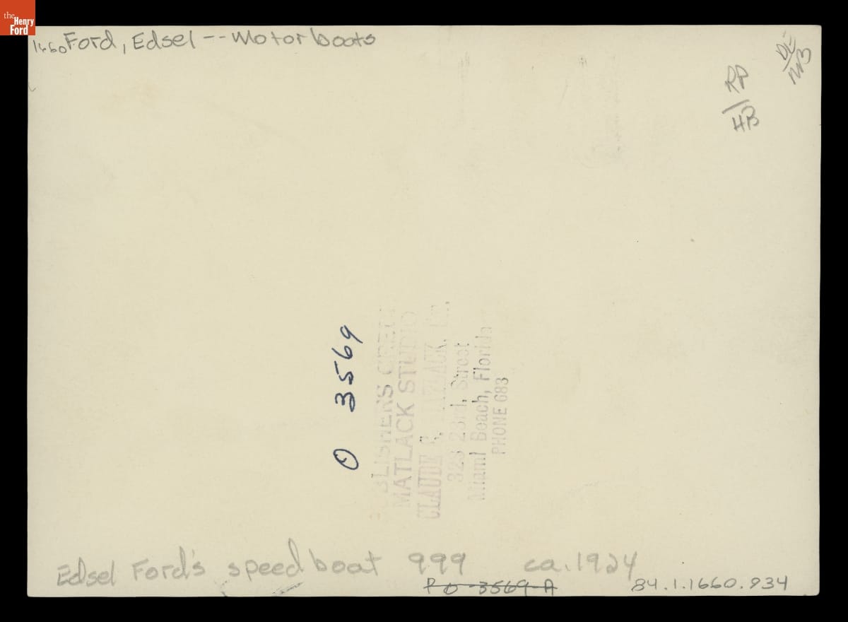 Edsel Ford named his speedboat Nine Ninety Nine in tribute to the "999" race car built by his father in 1902. The younger Ford enjoyed spending time on the water, whether sailing for pleasure on a yacht or racing at top speed in a powerboat.