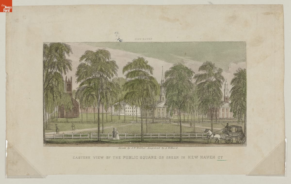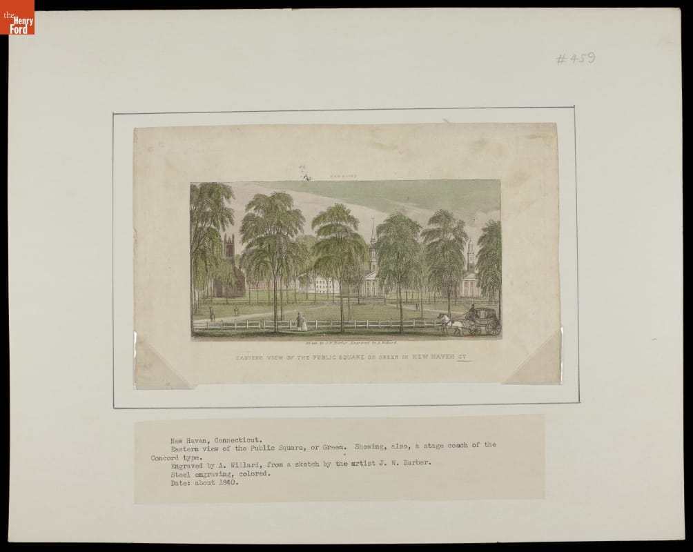 Description beneath: New Haven, Connecticut. Eastern view of the Public Square or Green showing also a stagecoach of the Concord type. Engraved by A. Willard from a sketch by the artist J.W. Barber. Steel engraving, colored. Date: about 1840.