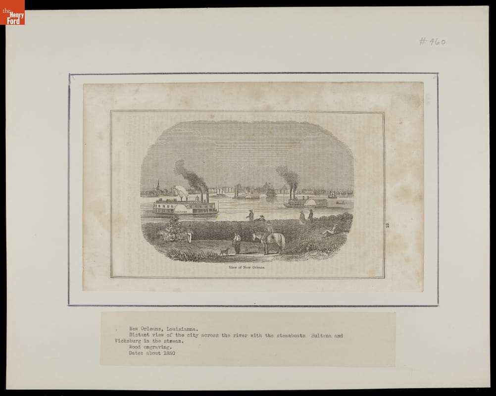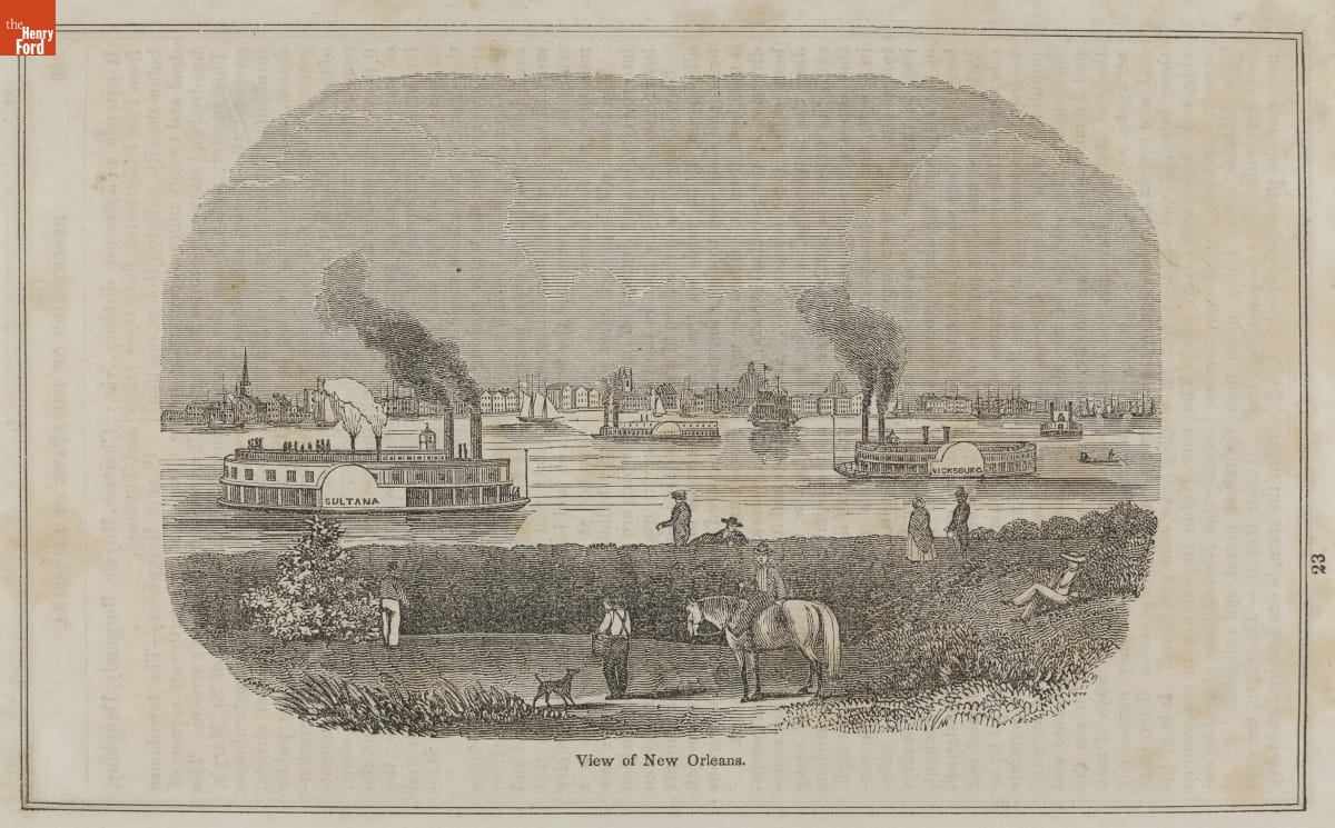 Description beneath: New Orleans, Louisiana. Distant view of the city across the river with the steamboats Sultana and Vicksburg in the stream. wood engraving. Date: about 1850