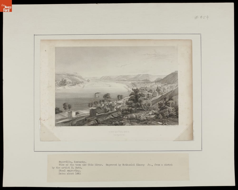 Typed on paper adhered on mounting board: Maysville, Kentucky. View of the town and Ohio River. Engraved by Nathaniel Kinsey Jr., from a sketch by the artist E. Bott. Steel engraving. Date about 1845. /.