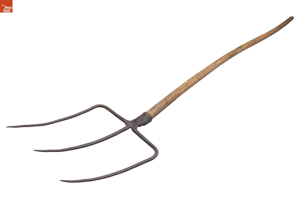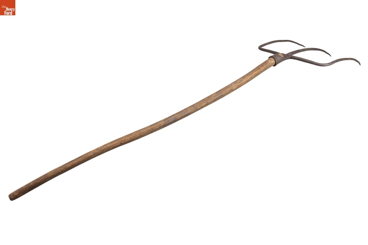Pitchforks worked as extensions of farmers' arms, allowing them to skewer, lift, and move larger quantities of hay, sheaves of grain, or straw than they could do with just their hands. They used different fork designs for different jobs. Two- and three-tine forks like this (with short metal points) worked best to pitch bundles of grain from field to wagon to thresher.