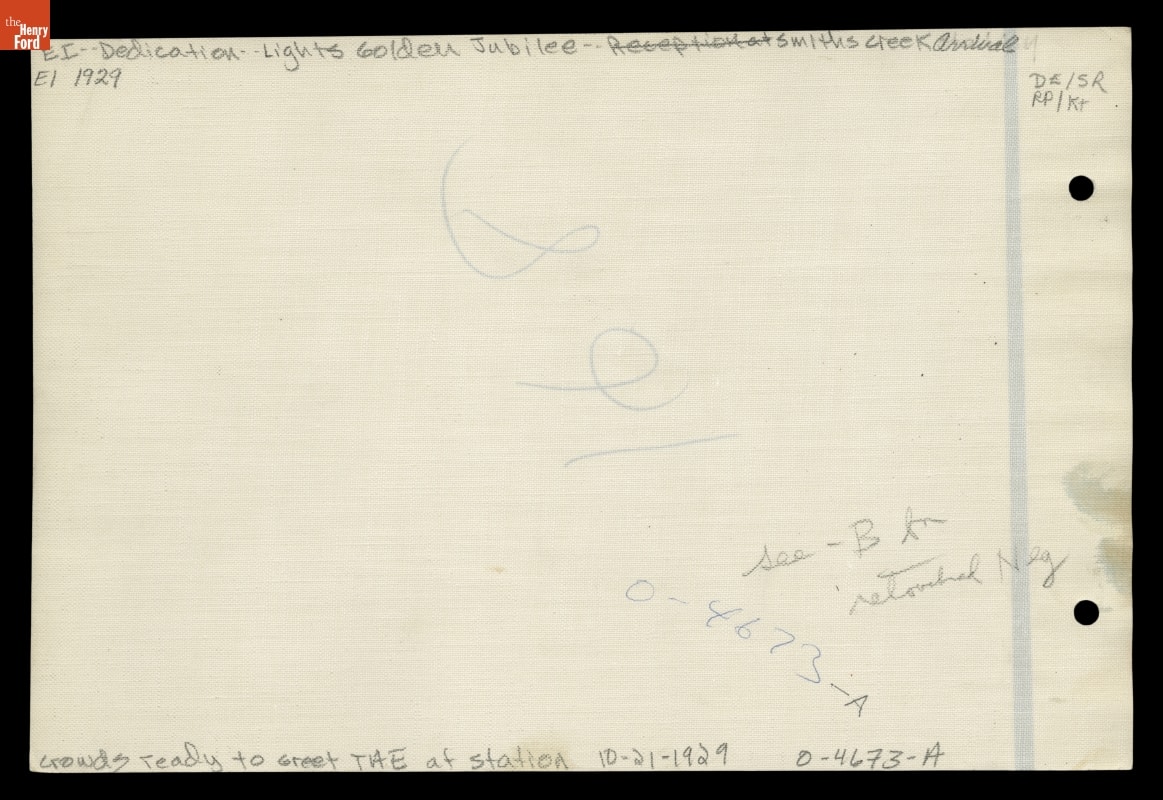 On October 21, 1929, Henry Ford hosted an elaborate celebration in Dearborn, Michigan, in honor of his friend Thomas A. Edison. Known as Light's Golden Jubilee, the event marked the 50th anniversary of Edison's invention of a practical incandescent electric lamp. The festivities began with Edison's arrival at Smiths Creek Station in Ford's Greenfield Village, where a number of distinguished guests waited.
