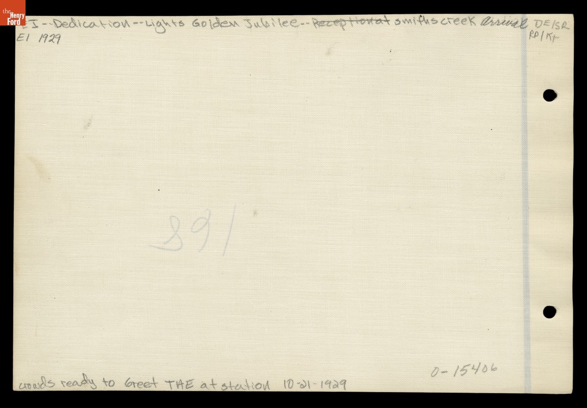 On October 21, 1929, Henry Ford hosted an elaborate celebration in Dearborn, Michigan, in honor of his friend Thomas A. Edison. Known as Light's Golden Jubilee, the event marked the 50th anniversary of Edison's invention of a practical incandescent electric lamp. The festivities began with Edison's arrival at Smiths Creek Station in Ford's Greenfield Village, where a number of distinguished guests waited.
