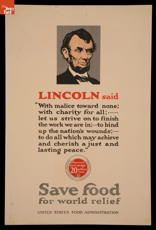 LINCOLN said / "With malice toward none; / with charity for all;... / let us strive on to finish / the work we are in;...to bind / up the nation's wounds;... / to do all which may achieve / and cherish a just and / lasting peace." / America's / food pledge / 20 / million / tons / Save food / for world relief / UNITED STATES FOOD ADMINISTRATION