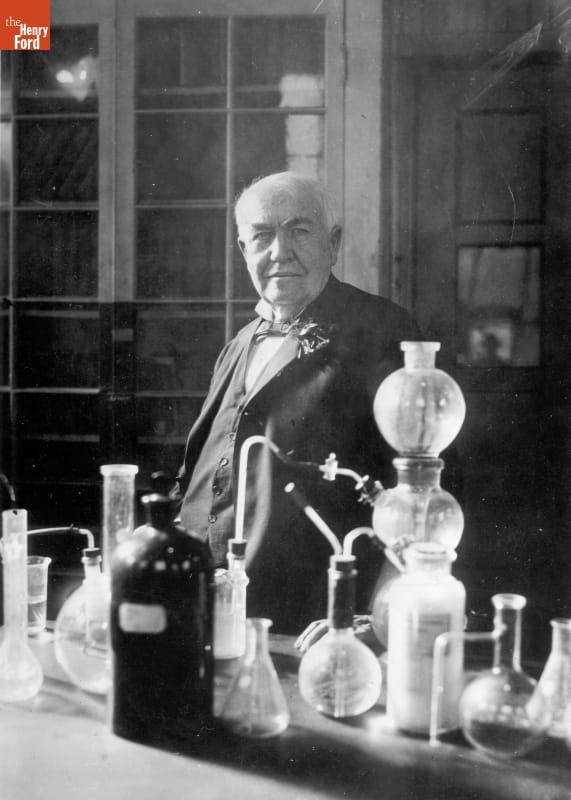 Inventor Thomas Alva Edison poses in his West Orange, New Jersey, laboratory where he directed teams of research assistants for nearly fifty years -- from 1887 until his death in 1931. More than half of Edison's 1,093 patents resulted from the collaborative work done in this complex, which became a model for modern research and development laboratories.
