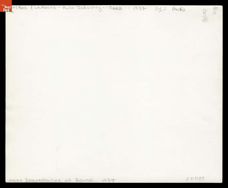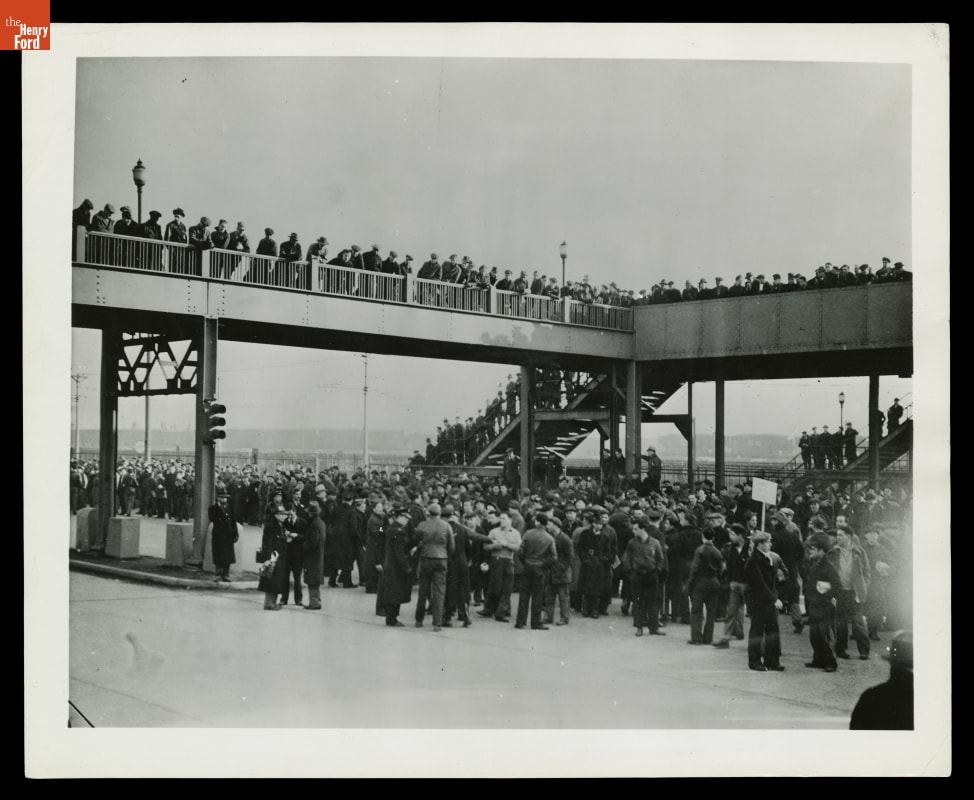 The struggle to unionize Ford Motor Company workers was long and--at times--violent. This photograph shows United Auto Workers (UAW) labor organizers demonstrating outside Ford's Rouge Plant pedestrian overpass during 1937. Four years later, following a turbulent ten-day strike in April 1941, Ford became the last major automotive manufacturer to recognize the UAW and agree to a union contract.
