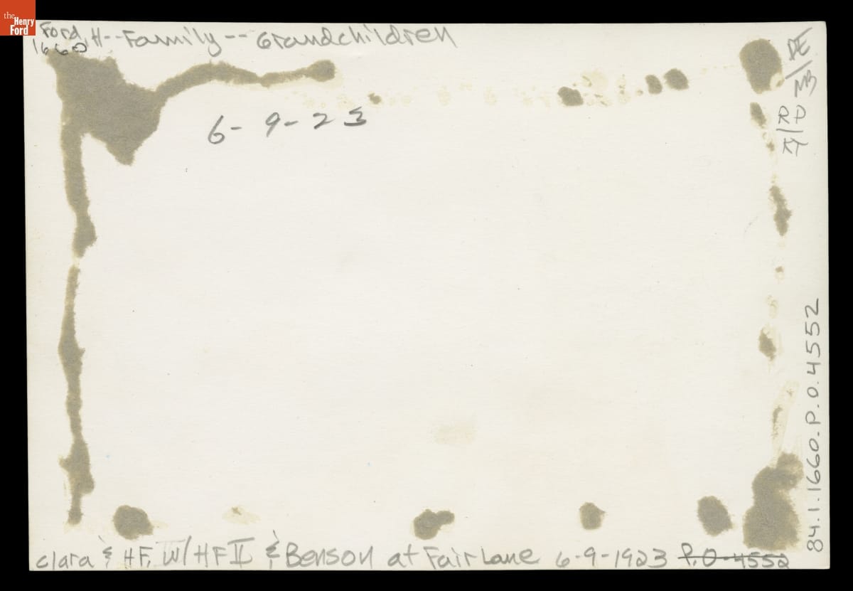 Clara Ford, Henry Ford II, Henry Ford, and Benson Ford in the Peony Garden at Fair Lane, Dearborn, Michigan, 1923