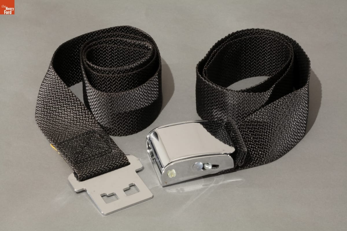 Until the mid-1960s seat belts were not standard equipment in American cars. Owners could purchase aftermarket safety belts like this one and have them installed. Continued education and growing acceptance for car occupants' safety have led most states to adopt seat belt laws.