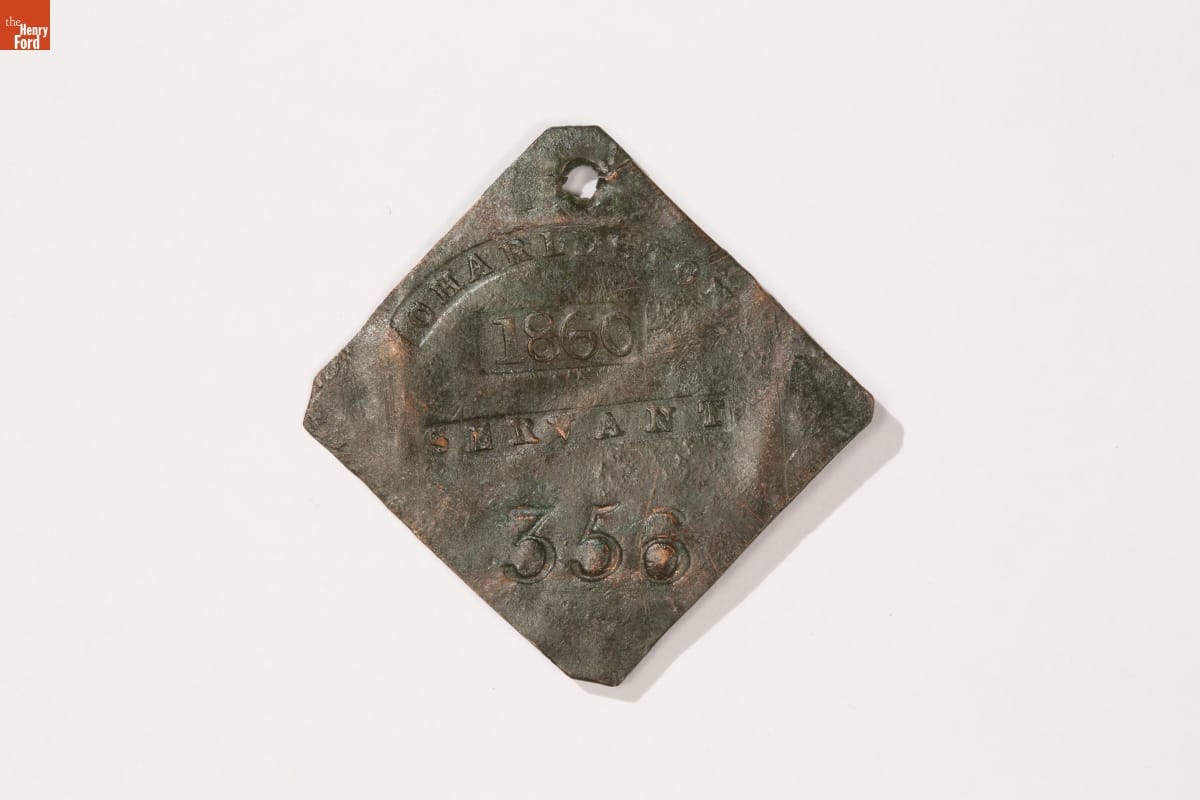 Slave hire badges were worn by enslaved African Americans whose owners hired them out to work for other people. Their wages went back to the owner. Badges were used to identify individuals in Savannah, Georgia; Charleston, South Carolina; Mobile, Alabama; and New Orleans, Louisiana. This badge for a servant was issued in Charleston.