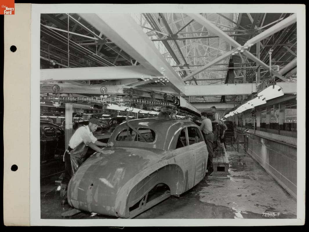 Car Bodies Wet Sanded on Assembly Line, Ford Rouge Plant, 1940