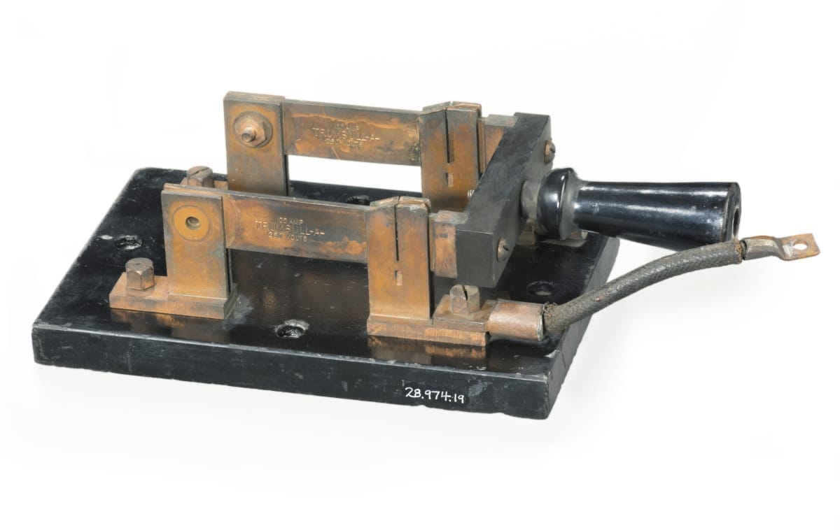 Switches open or close an electrical circuit to turn things off or on. In the late 1800s and early 1900s, knife switches were commonly found in engine or generating rooms, connected to factory motors, or mounted on a building's power and lighting switchboard. Operators pushed the hinged, metal blades into the switch's jaws to send electricity to where it was needed.