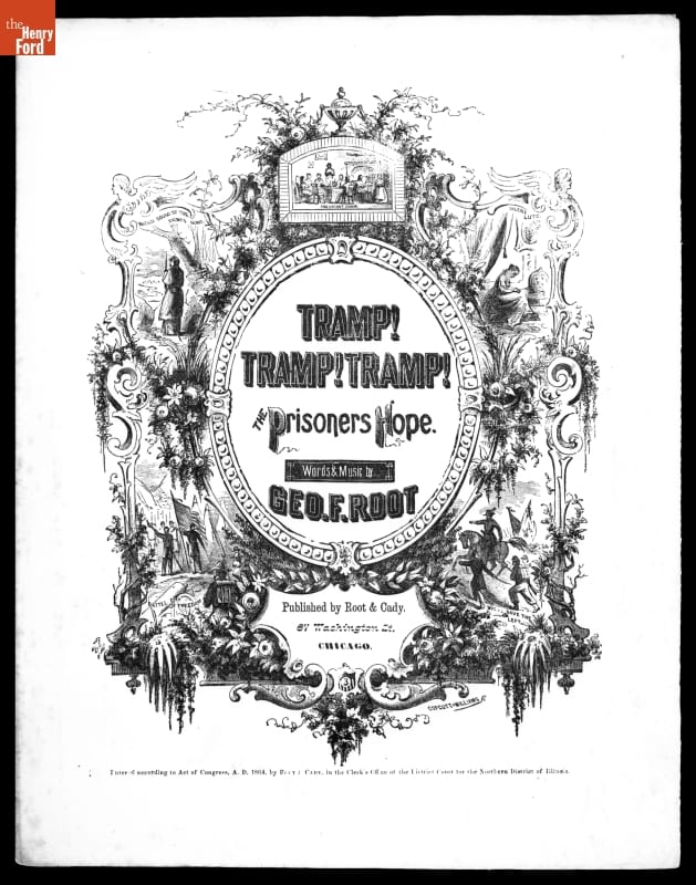 Composed by George F. Root during the Civil War, this song expresses the hopes of an imprisoned Union soldier. The song's melancholy verses give way to the chorus of "Tramp! Tramp! Tramp!" -- signaling the oncoming liberators and the time when the prisoner will return to his beloved home. It became a popular song during the war.