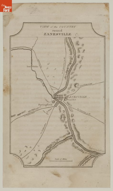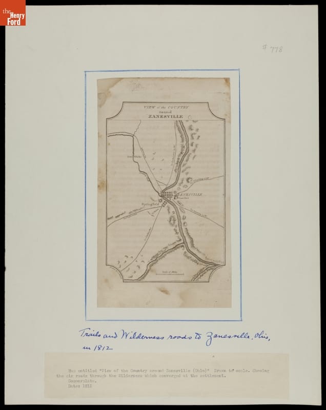 This 1812 copper-plate engraving features a map of the area surrounding and the wilderness roads leading to and from Zanesville, Ohio. Zanesville was settled in 1797 where Colonel Ebenezer Zane's frontier road known as "Zane's Trace" crossed the Muskingum River in present-day Ohio.