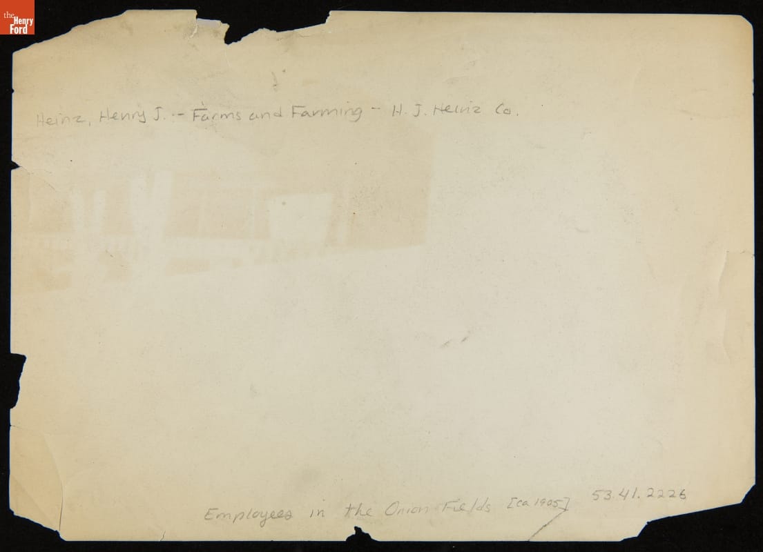 Entrepreneur H.J. Heinz recognized that producing high-quality products began with growing the best ingredients. He managed every aspect of the process from seed selection through harvest to ensure that only the best ingredients became Heinz pickled foods, preserves, and condiments. This photograph shows laborers -- boys and girls as well as men with walking cultivators -- wedding an onion field.